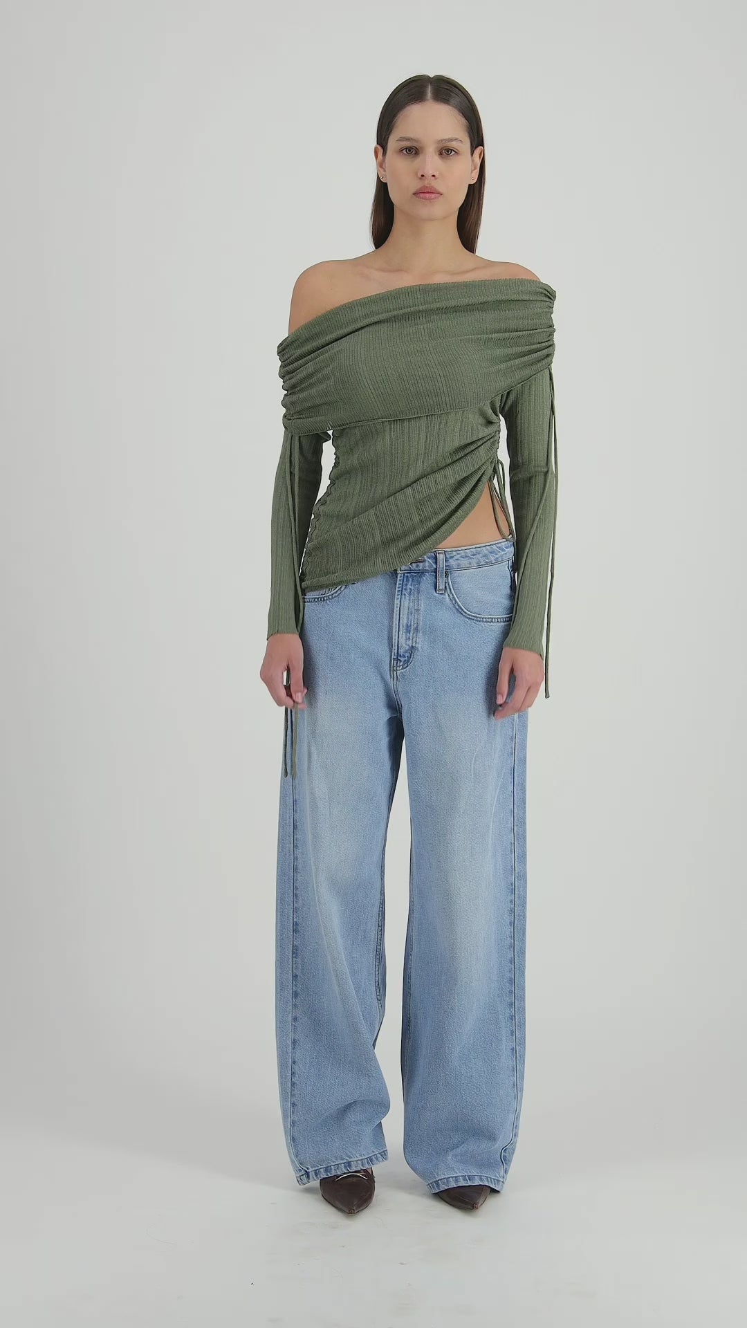 Off shoulder top with rushed sides for a fitted look, can also be worn as a turtleneck