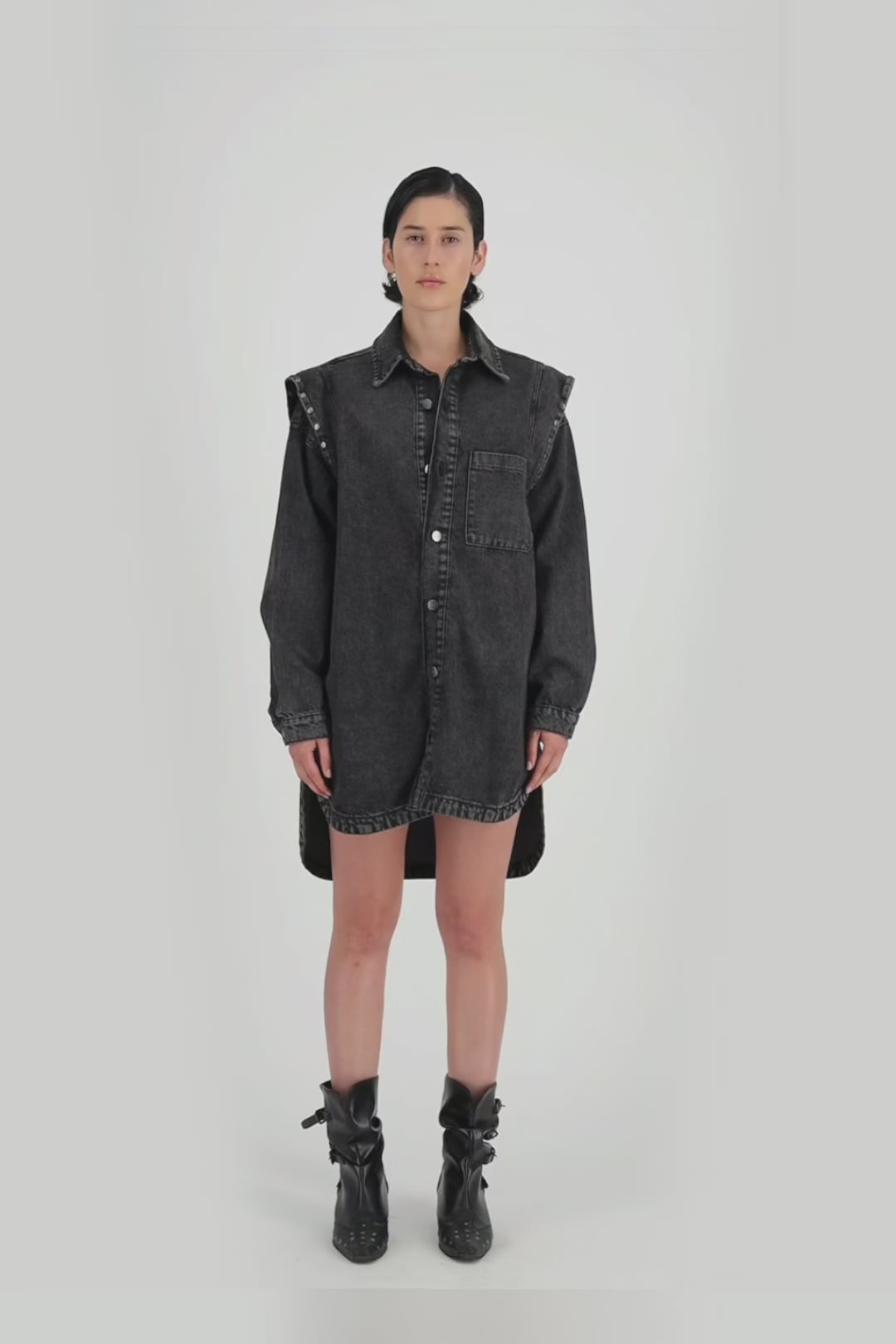 Black denim shirt dress with button-front closure, chest pocket, and studded shoulder details.