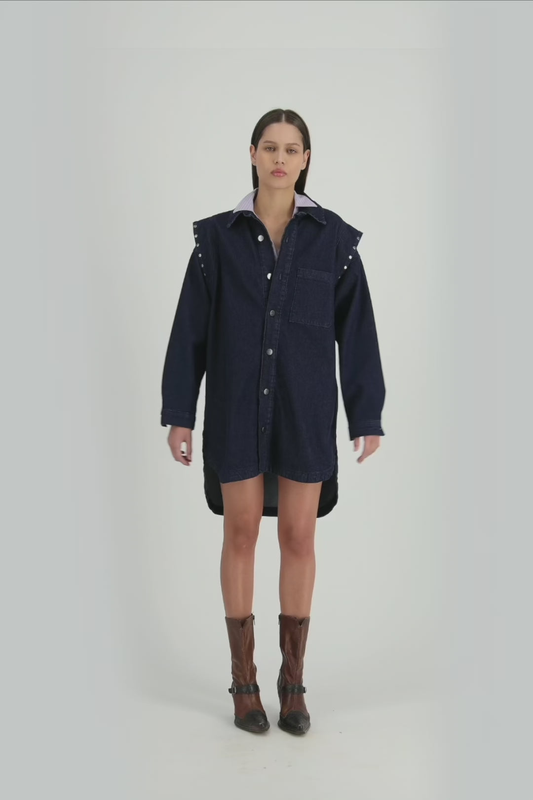 Medium Blue denim shirt dress with button-front closure, chest pocket, and studded shoulder details.