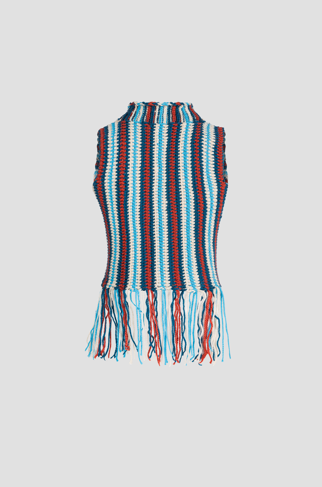 Sleeveless High Neck Fringed Crochet - Blue x Red